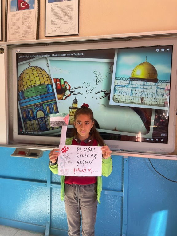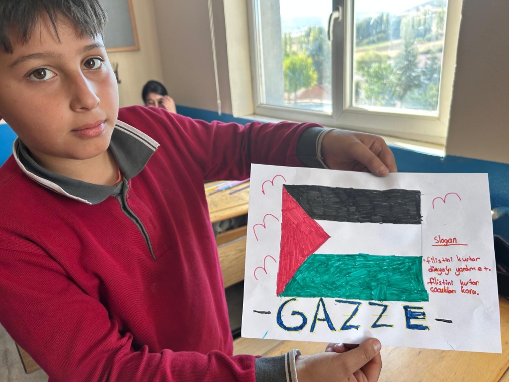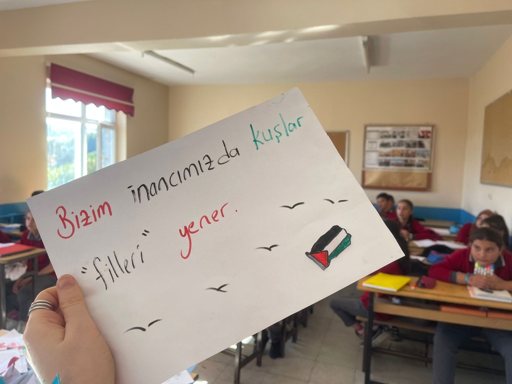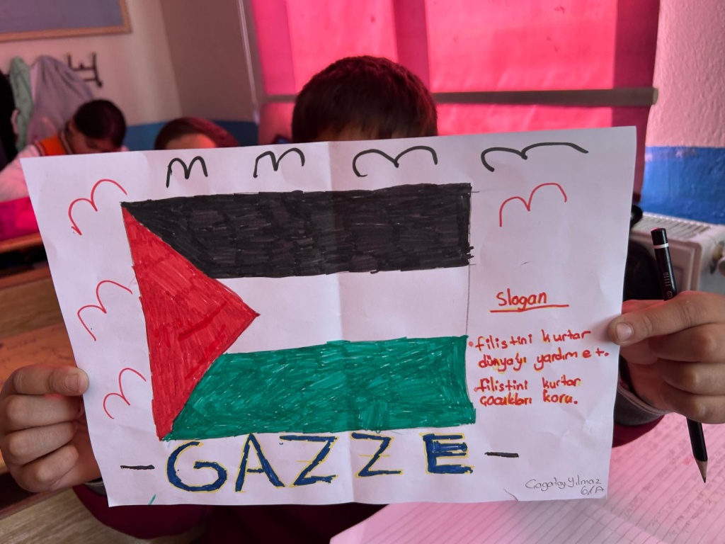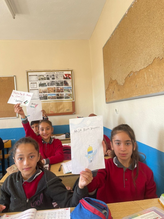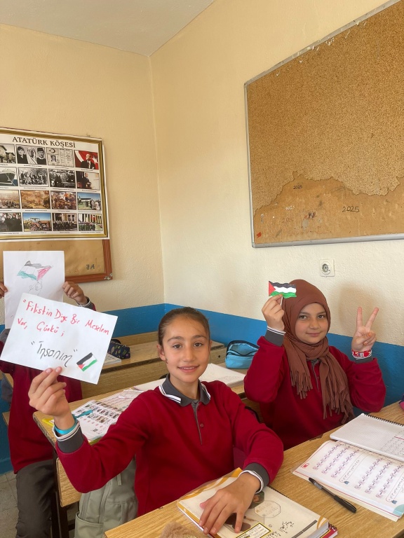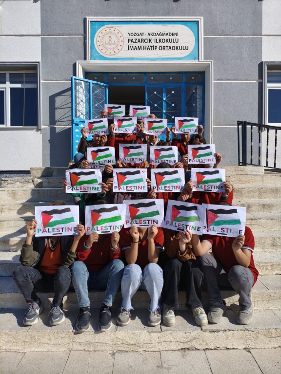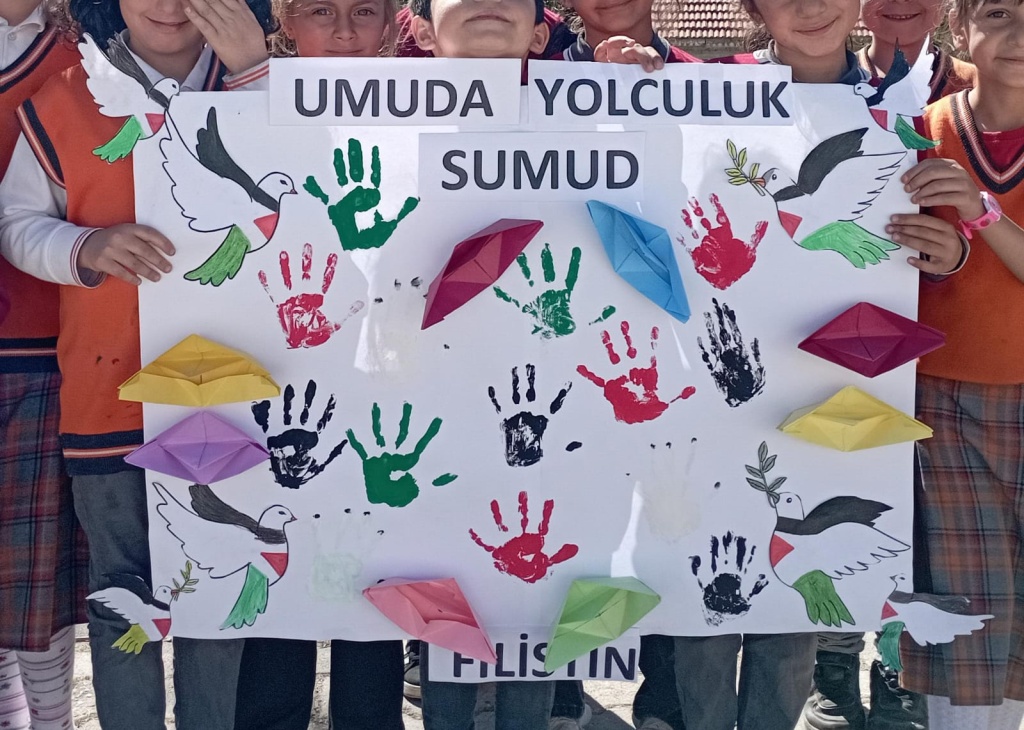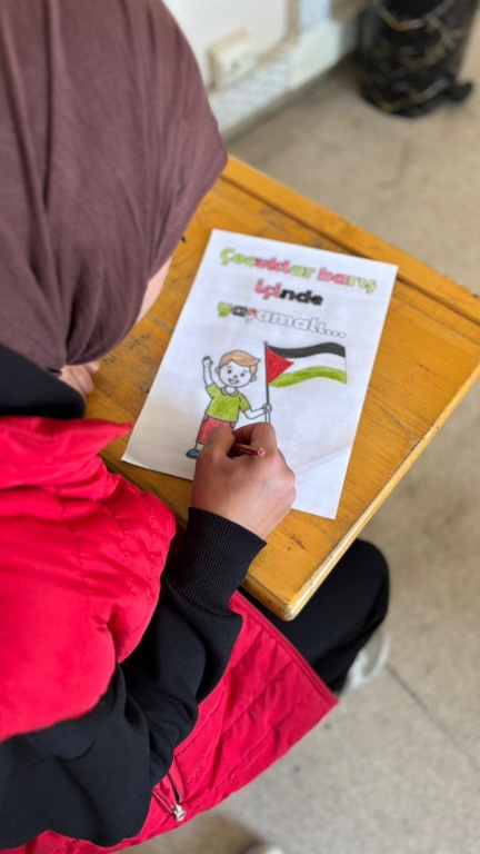Okulumuzda yürekler Filistin için attı… Ortaokul öğrencilerimiz, kalplerinde taşıdıkları kardeşlik duygusunu “Filistin İçin Tek Yürek” etkinliğinde anlamlı çalışmalarla ortaya koydular. Etkinlikte öğrencilerimiz, Filistin’de yaşanan acılara sessiz kalmayarak hem düşündüler hem de hislerini resimlerle, şiirlerle, şarkılarla fade ettiler. Filistin bayrağının renklerinde bileklikler yaptılar; bu bileklikleri “Umuda, direnişe ve özgürlüğe bir sembol” olarak bileklerine taktılar. ️ Özgürlüğü temsil eden kuş resimlerini Filistin bayrağının renkleriyle boyadılar; her kuş, çocukların hayallerinden doğan bir umut mesajı taşıdı. ️ Etkinlik boyunca öğrencilerin sesinden yükselen dualar yüreklerinden gökyüzüne ulaştı. “Filistin yalnız değil, biz buradayız.” Kimisinin elinde boya kimisinin gönlünde dua Ama hepsinin kalbinde aynı inanç: Bir gün barış kazanacak, çocuklar yeniden gülecek. Etkinliğin sonunda öğrenciler, yaptıkları bileklikleri gururla bileklerine takıp, boyadıkları resimleri panolara asarken öğretmenlerimiz de bu duyarlı, merhametli duruşları için onları takdir etti. Bugün bir kez daha gördük ki; küçük kalplerin vicdanı, dünyanın sessizliğinden çok daha gür çıkıyor…